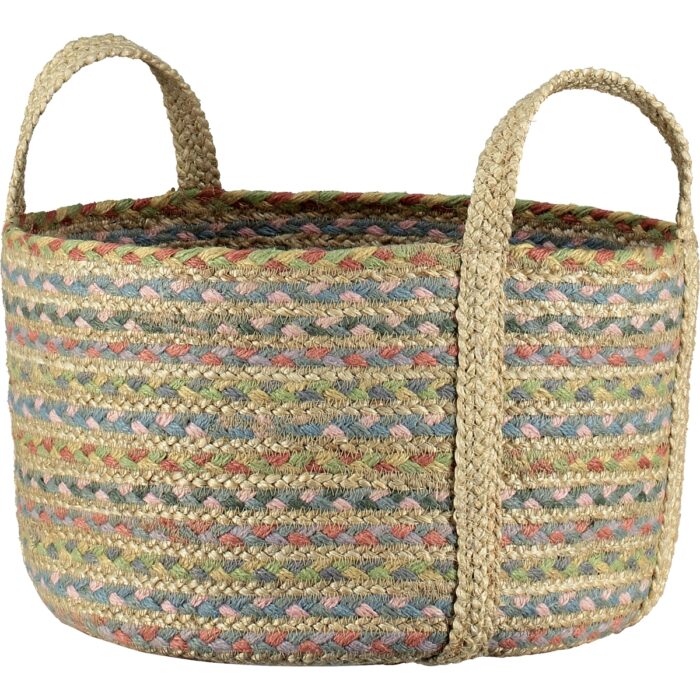 The Pastel Fairisle design mixes soft pinks, blues and greens with natural jute and had the handle details down the side.