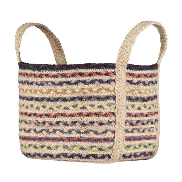 The Fairisle design mixes colourful stripes with natural jute and has the handle details down the side.
