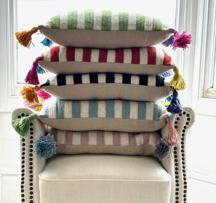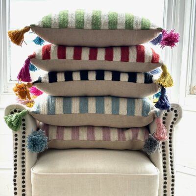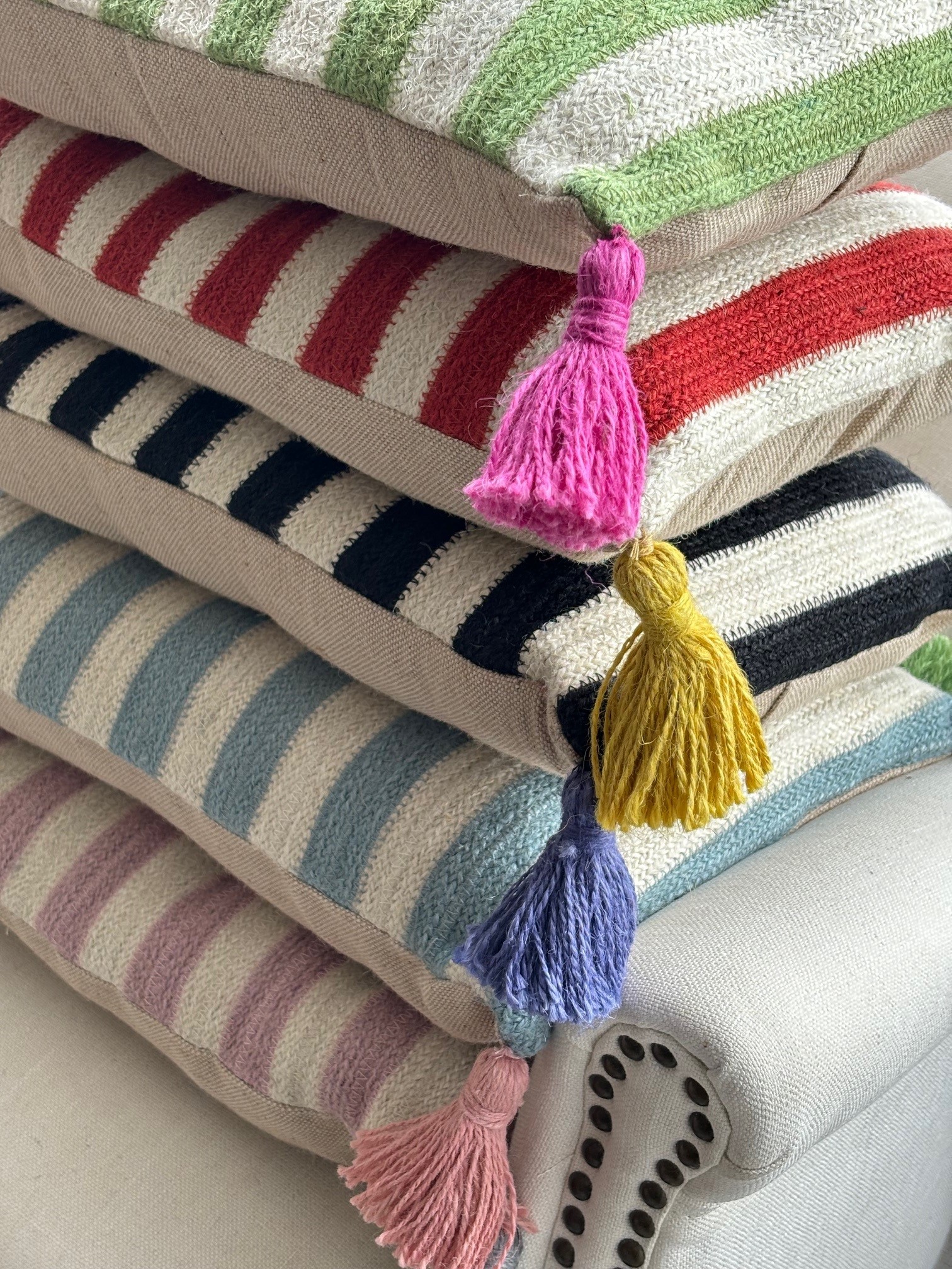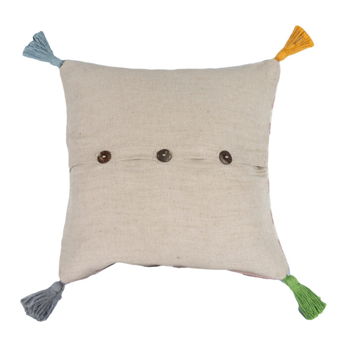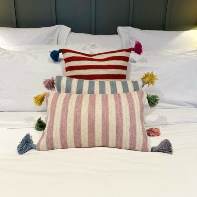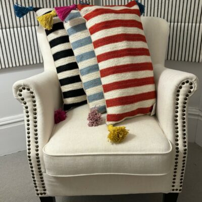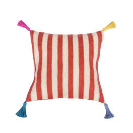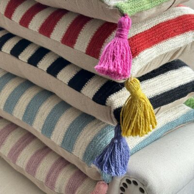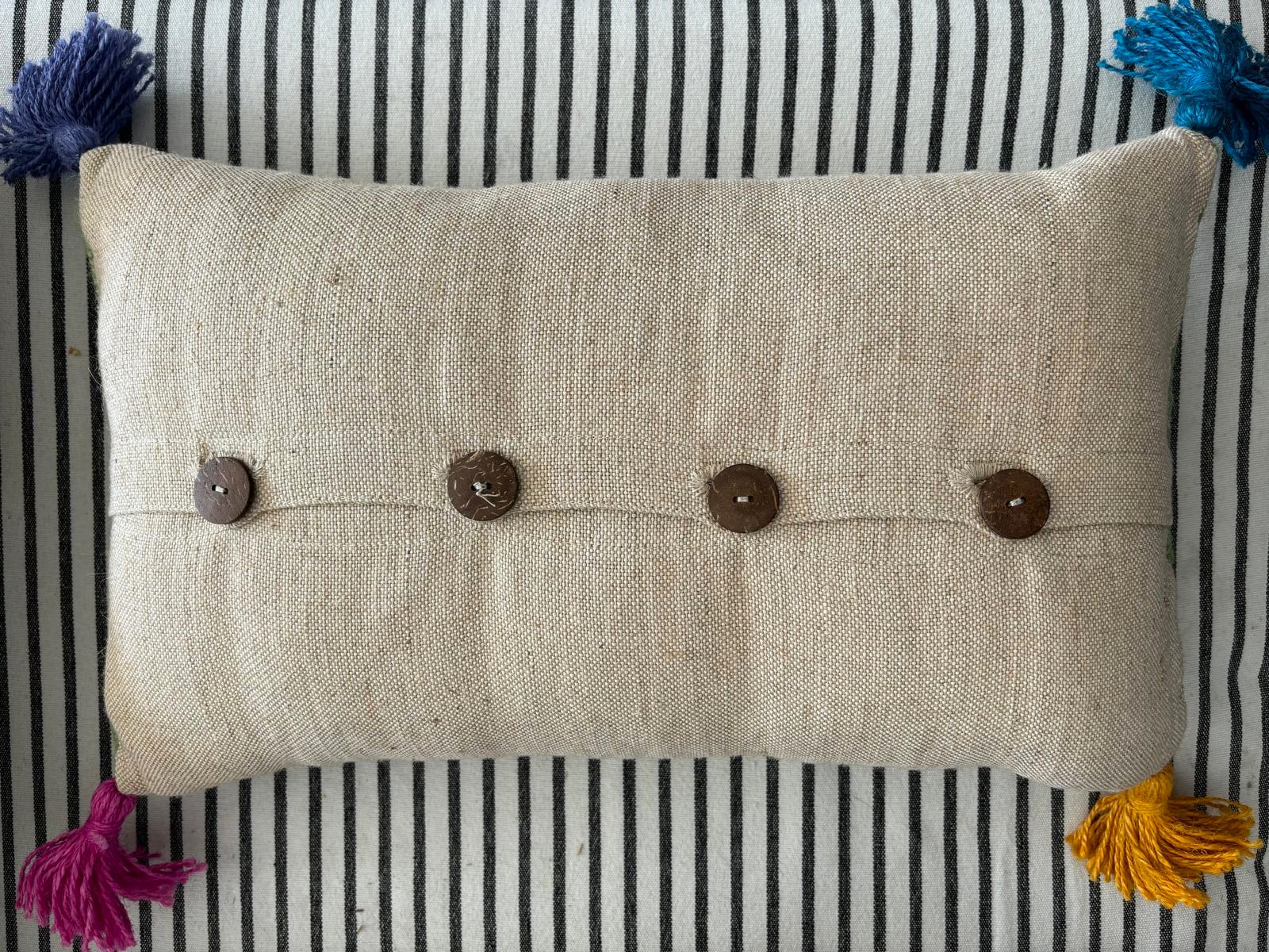 Stripe design on the front, plain on the back with coconut shell buttons to fasten. Handmade coloured tassels in each corner for a pop of colour!