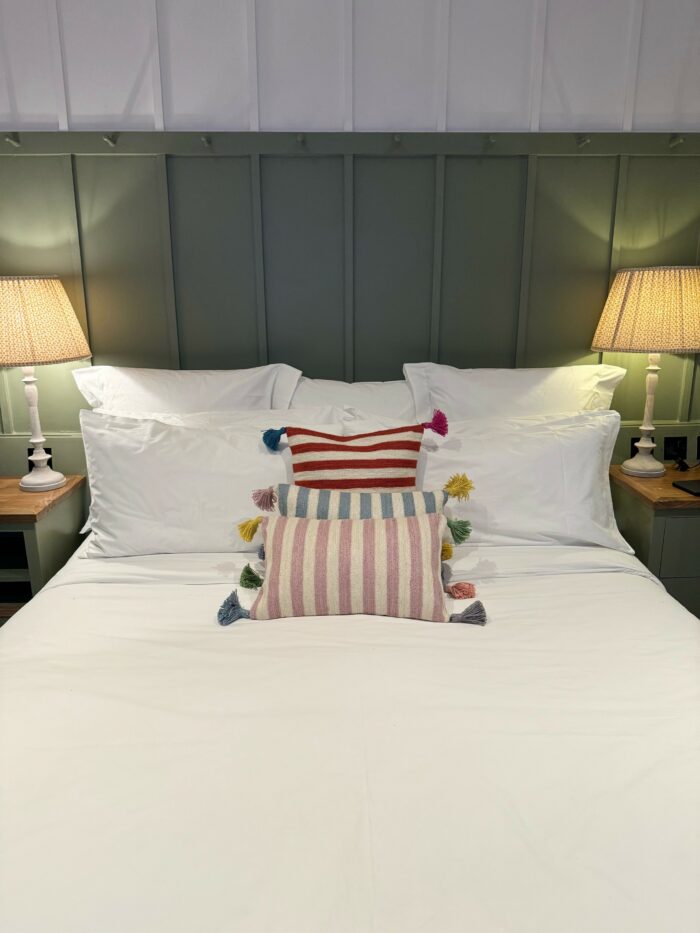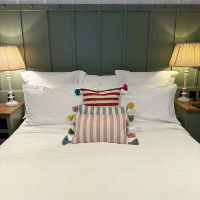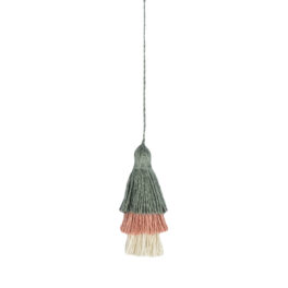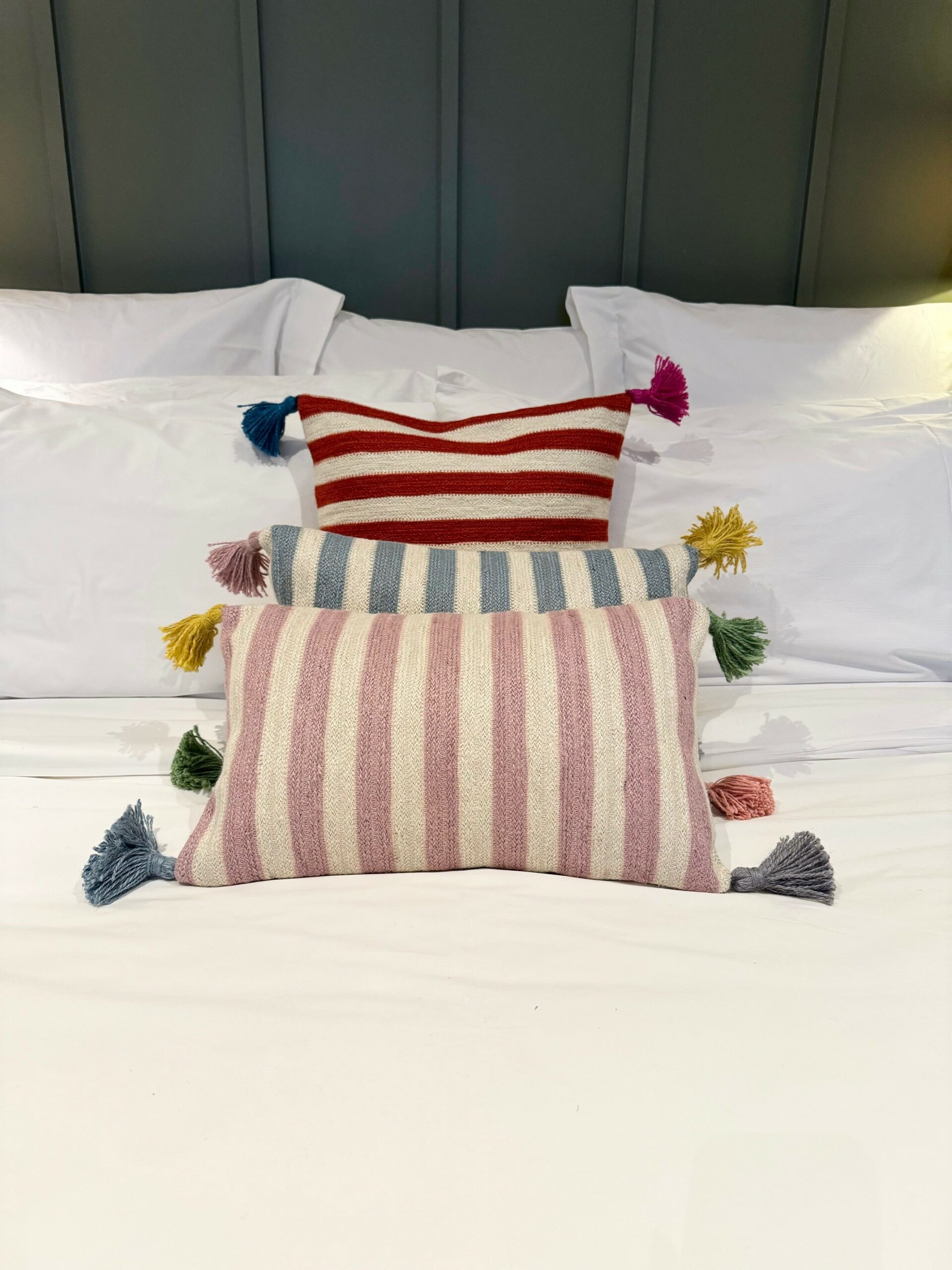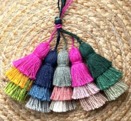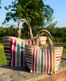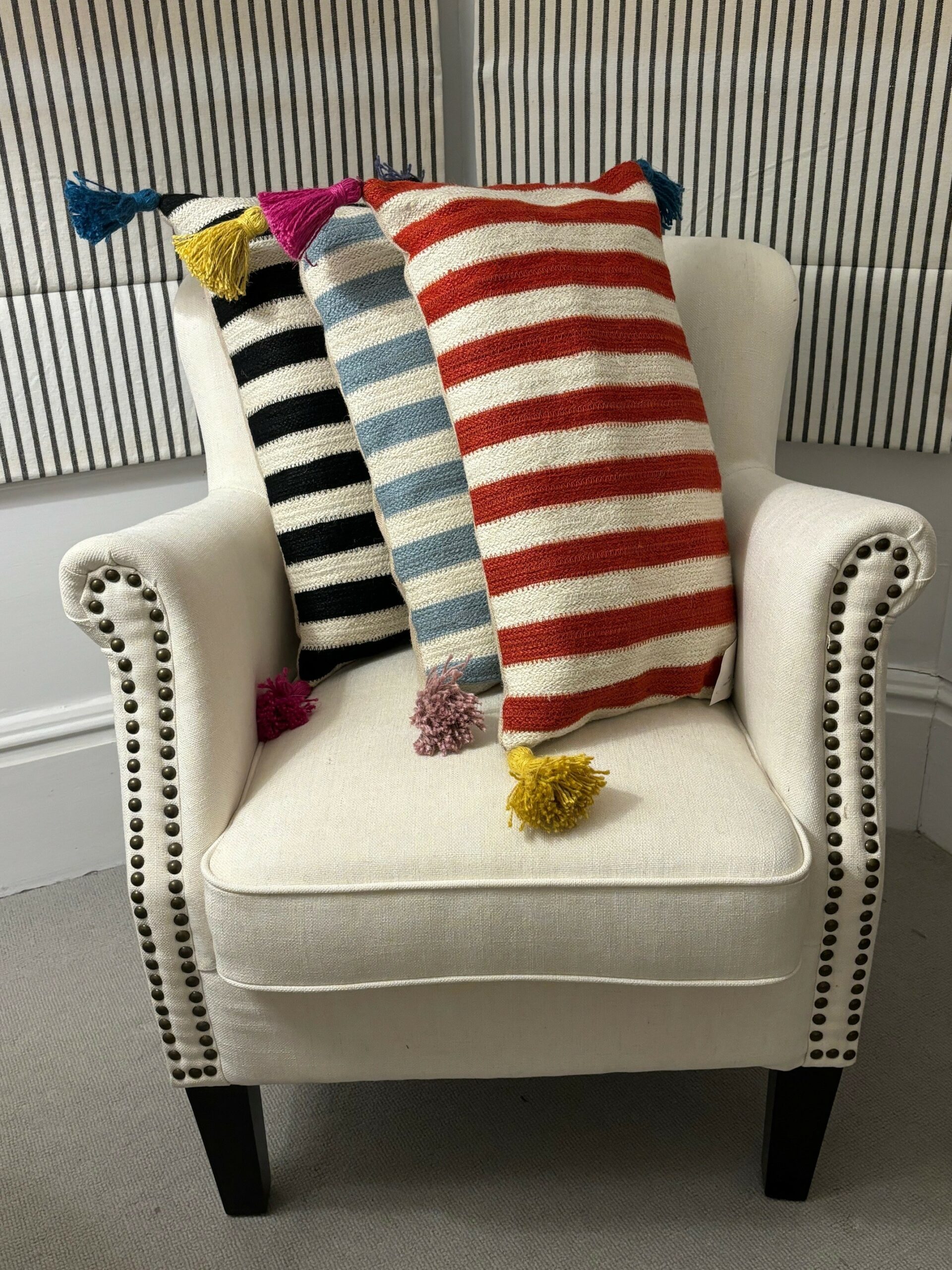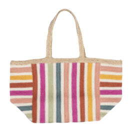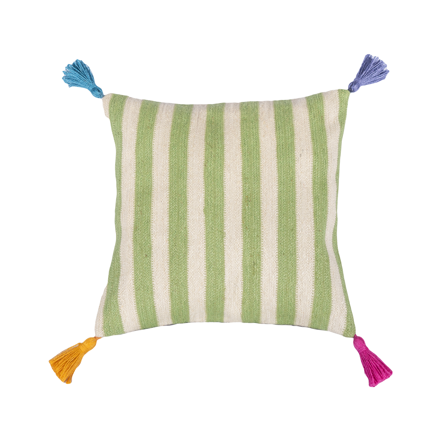 Stripe design on the front, plain on the back with coconut shell buttons to fasten. Handmade coloured tassels in each corner for a pop of colour!