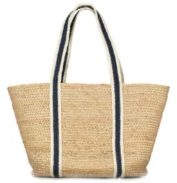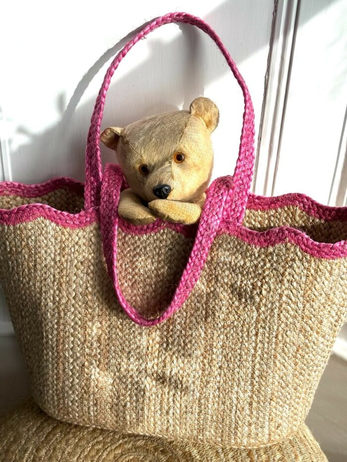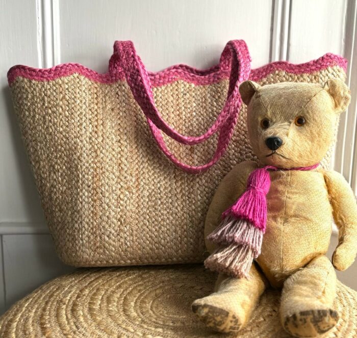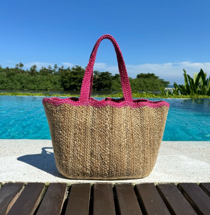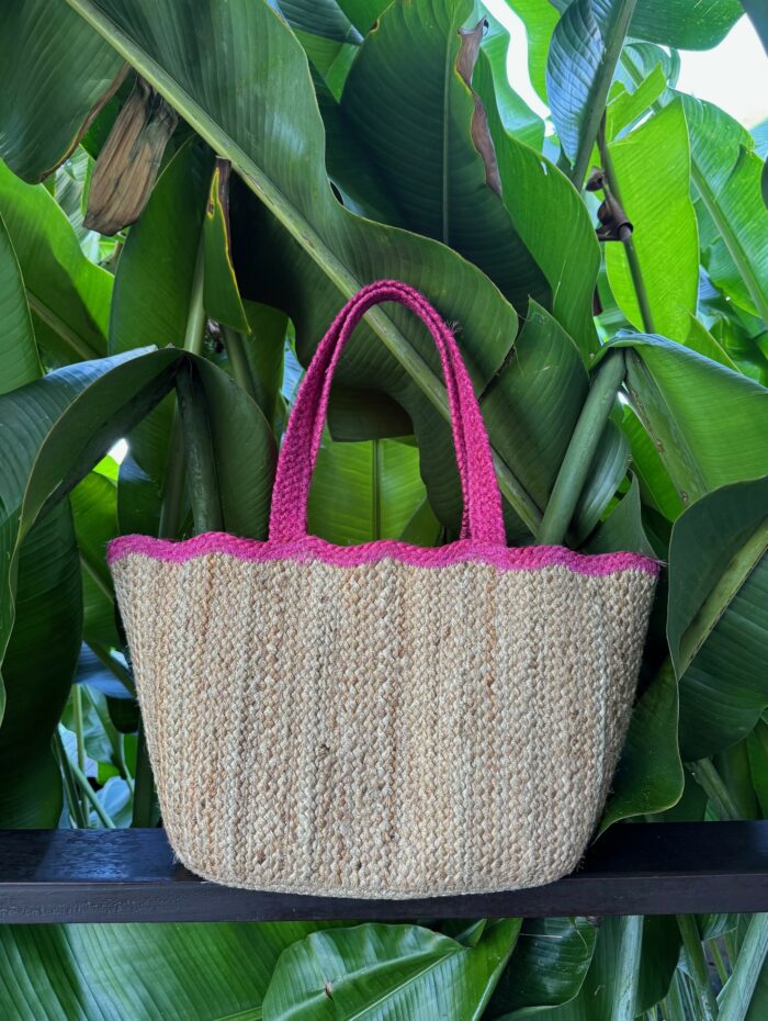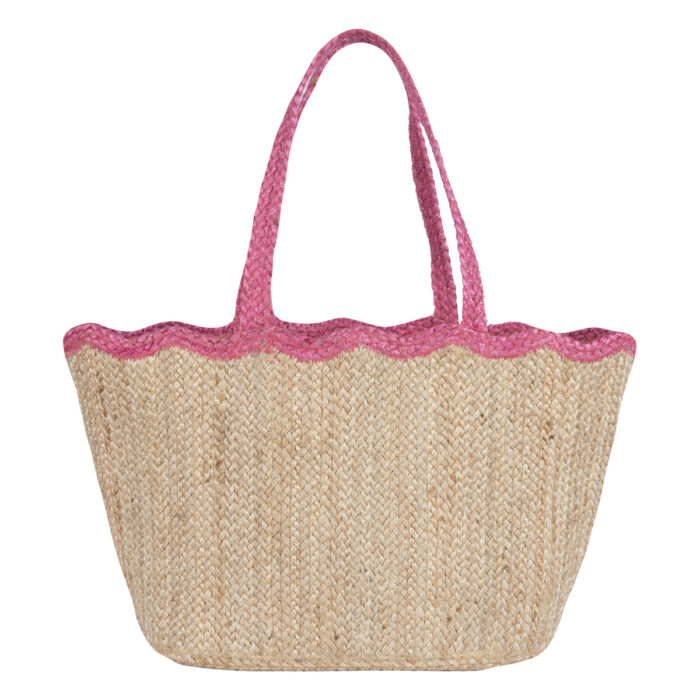 Natural scalloped tote with a magenta edge and long handles. Available in two sizes.