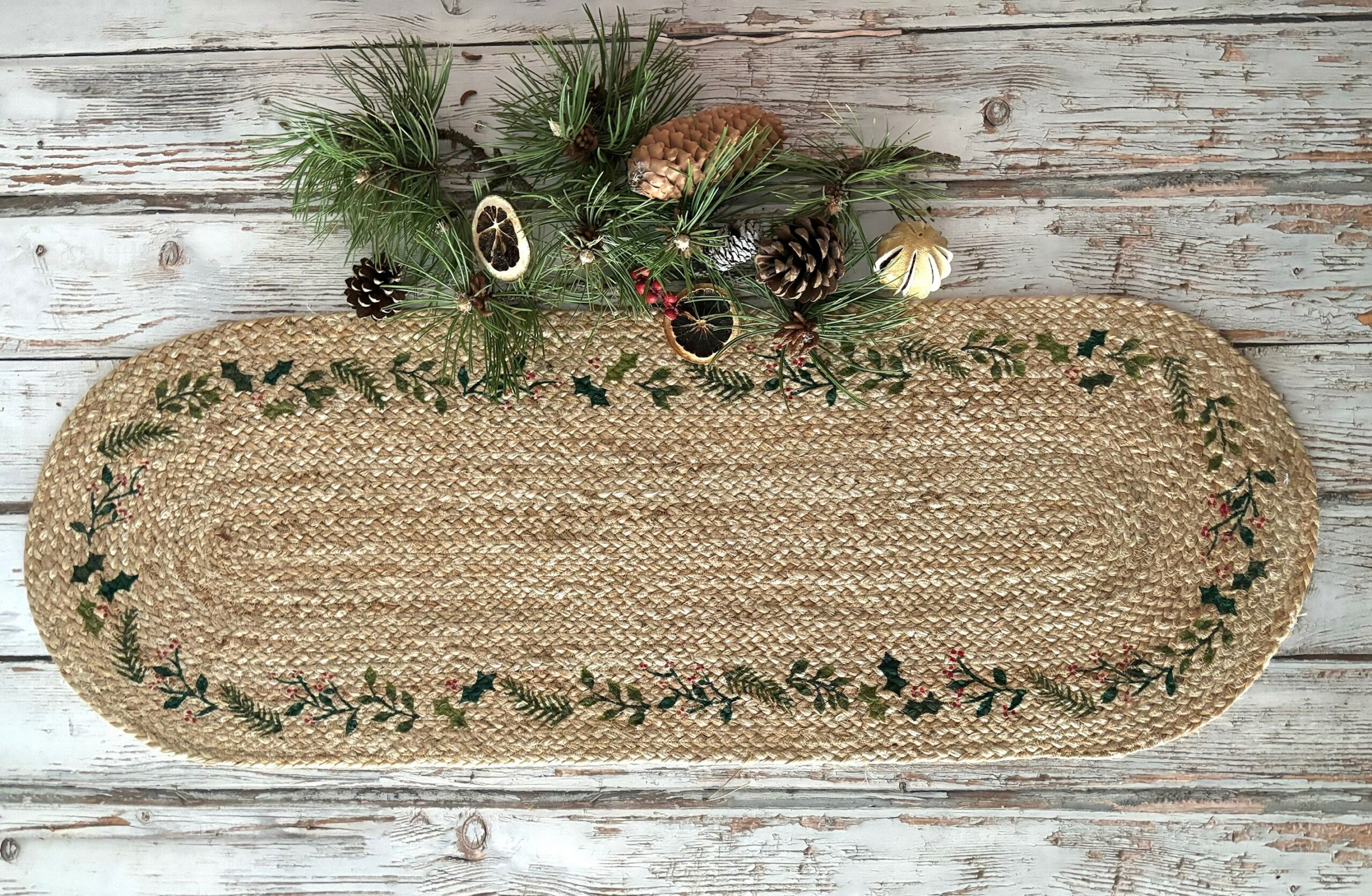 Our Natural Christmas Table Runner is printed with a simple wreath design.